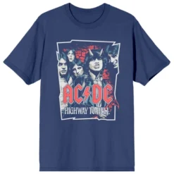 Rock out in style with this ACDC tee. The shirt features an image of the band members with horns while red and white letters below read, “ACDC, Highway To Hell.” The tee comes in a navy short sleeve crew neck and is made with high-quality cotton materials. ACDC fans will love this comfy tee.