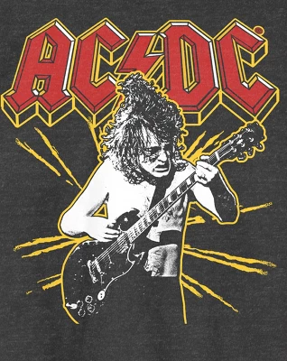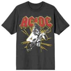 Rock out in style with this ACDC tee. The shirt features an image of a band member playing his guitar in front of a yellow spark under red letters that spell out the rock band’s logo. The tee comes in a charcoal heather short sleeve crew neck. ACDC fans will love this comfy t-shirt.