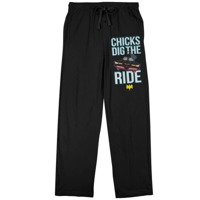 - GRAPHIC DESIGN: Batman and Robin go for a joy ride in the Batmobile while white text surrounding the characters spells out, “Chicks dig the ride.” A yellow bat symbol is printed below the text. These pants make a great gift for Batman fans.