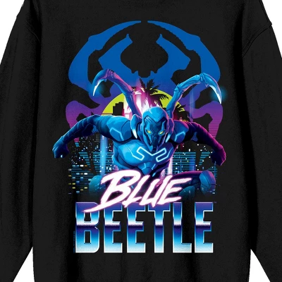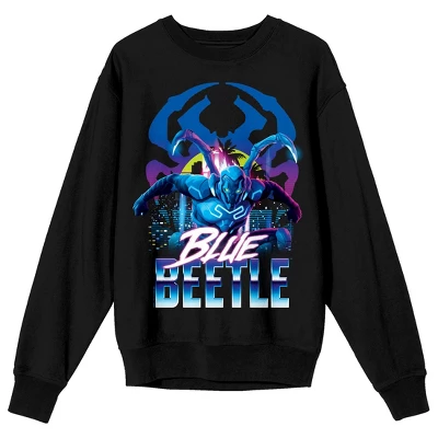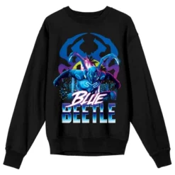 - CUSTOM DESIGN: This men’s black Blue Beetle crew neck long sleeve sweatshirt features a unique design that showcases Jaime Reyes in his Beetle Suit in front of the logo. The superhero name is spelled out in eye-catching pink and blue letters.