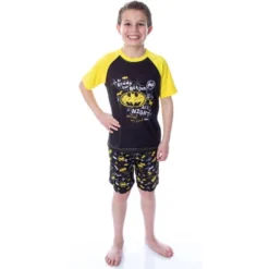 - SUPER FUN AND UNIQUE DESIGN – – This 2 piece Batman pajama outfit features a short sleeve raglan top with a fun front design that looks like Batman’s biggest fan drew it! It reads “Ready for Action All Night” and Batman, My Hero! The shorts have an allover design of Bat logos, Batmobile’s, Bat face masks, and more in that same drawn style.