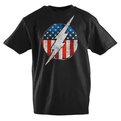Celebrate America in the best way with this American Flag and DC Comics Flash TShirt crossover! The Flash Superhero Clothing is an a boys black tee with a classic crew neck, short sleeve design that kids will love to wear everywhere they go! The Flash Symbol Boys Graphic Tee features a bright, bold, soft hand print graphic across the front of the tee of the Flash symbol in the red, white, and blue of the American flag! The Patriotic DC Comics Apparel is made of 100% cotton material that is soft and comfortable to wear and is machine washable for quick, easy care. The Flash Red White and Blue Shirt is available in boys youth sizes XS – XL.
