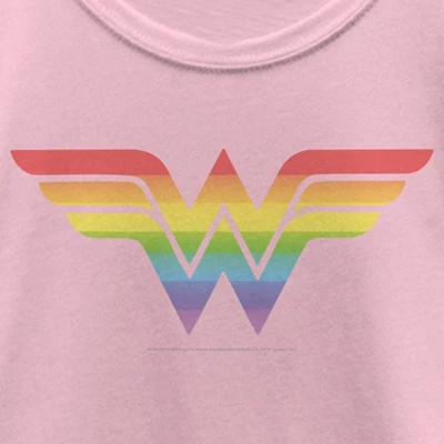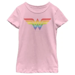 - Strut your stuff with this stylish new girls’ t-shirt that is perfect for every occasion! Featuring the emblematic Wonder Woman winged symbol in a colorful rainbow print.