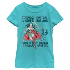 - Strut your stuff with this stylish new girls’ t-shirt that is perfect for every occasion! Featuring the powerful Wonder Woman ready to use her Lasso of Truth and the statement: “This Girl is Fearless” in collegiate font.