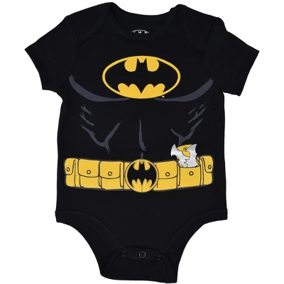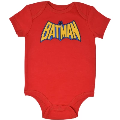 • Bodysuit 1: red with the word “BATMAN” in bright yellow letters; Bodysuit 2: black with Batman logo, muscles and utility belt; Bodysuit 3: unique multicolored all-over print logo design; Bodysuit 4: yellow with Batman logo and the words “A hero never sleeps”; Bodysuit 5: grey with Batman logo, muscles and utility belt