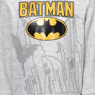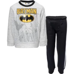 Your little comic book fan is ready to play in this cozy Batman outfit. This pullover sweatshirt and pants set features the cool black-and-yellow Batman logo with sketched artwork of the Dark Knight that will have your little boy ready to join the DC Comics hero on all his adventures. Made of a soft fleece material that keeps your little boy comfortable, this cute set is the perfect outfit for a fun day.