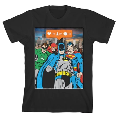 - GRAPHIC TEE: The Green Lantern, The Flash, Batman, and Superman pose for an Instagram photo on this graphic tee. Boys can wear this t-shirt to create their own epic photos to share with friends and family.
