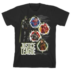 - GRAPHIC TEE: Superman, The Flash, Green Lantern, and Aquaman appear in blue, yellow, red, and green hexagons as Batman looks on. The words Justice League are printed in white at Batman’s feet. This tee makes a great gift for Justice League fans.