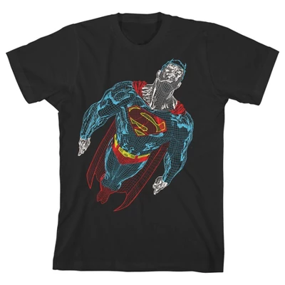 Take to the skies with this Superman youth tee. The shirt features the superhero in flight made out of geometric art. The hero wears a blue suit with a red cape and has grey skin in this graphic. Celebrate the all-star superhero’s legacy with this boy’s tee.