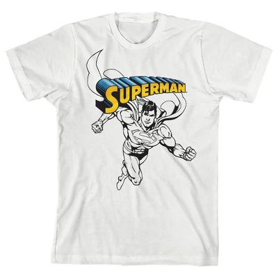 Celebrate your favorite superheroes with this Superman tee. The shirt features lineart of the superhero flying under yellow letters that spell out his name. The tee comes in a white short sleeve crew neck and is made with high-quality cotton materials. Superman fans will love this comfy tee.