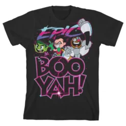 - GRAPHIC TEE: Beast Boy, Robin, and Cyborg celebrate with a victory dance on this graphic tee. A multi-colored Epic appears above them while the words, “Boo Yah,” are printed in black text below the heroes. Fans of the Titans will love this tee.