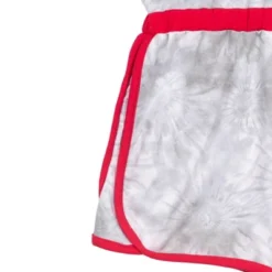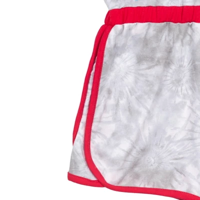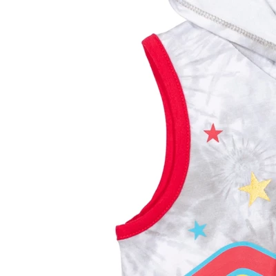 - Featuring Wonder Woman logo with stars, gold ink accents, and the words “Wonder Woman” on romper top; All-over gray and white tie-dye print; Contrast red binding and hems